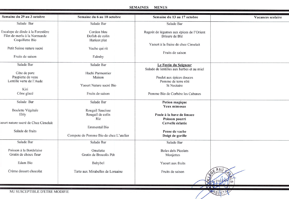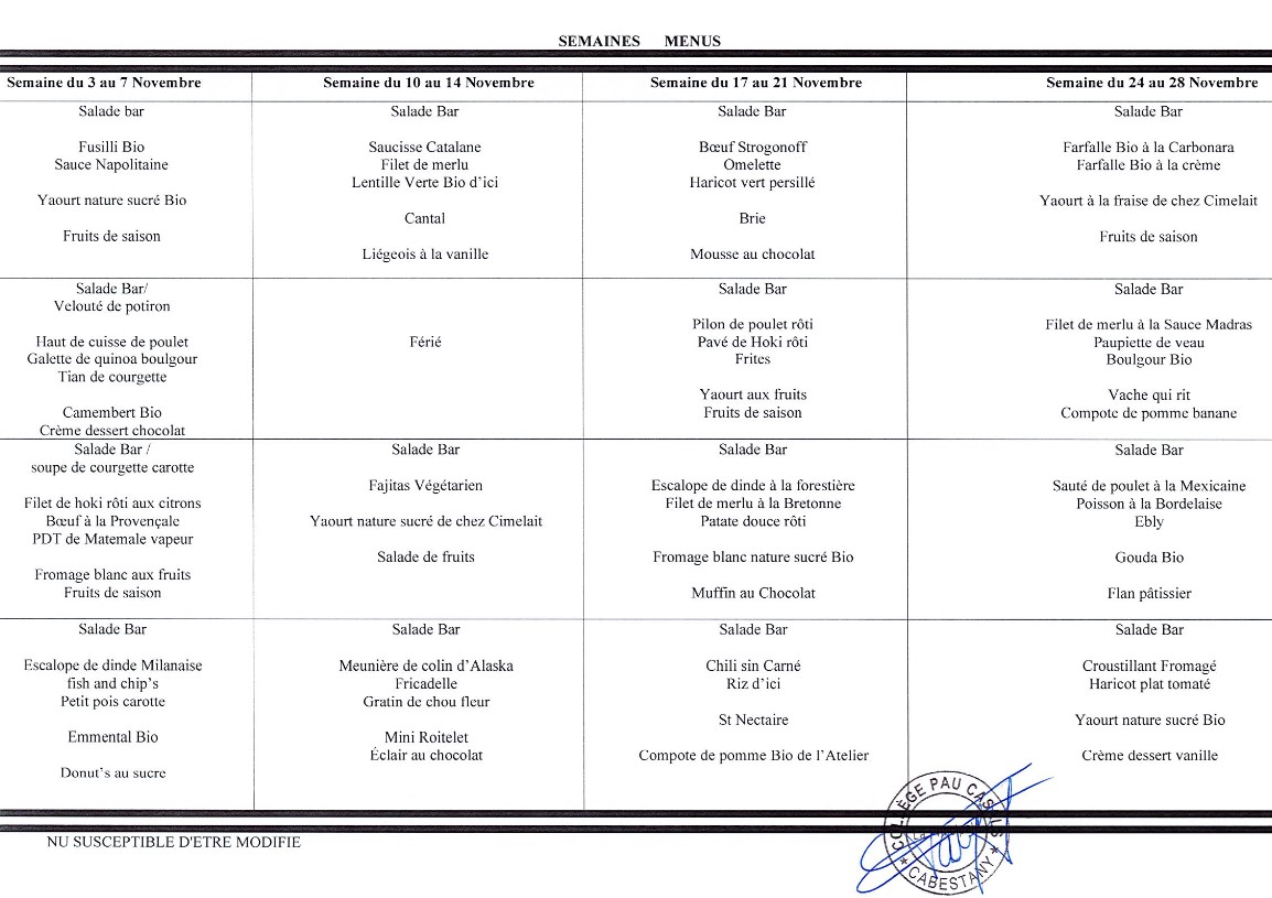 Ici, vous trouverez les menus de la cantine du mois en cours.